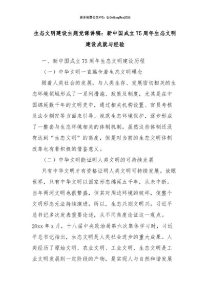 【七哥公文】2024年:生态文明建设主题党课讲稿:新中国成立75周年生态文明建设成就与经验+更多免费公文+VX:QiGeGongWen2024