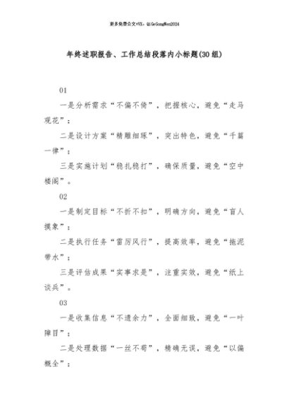 【七哥公文】2024年:(30组)年终述职报告、工作总结段落内小标题+更多免费公文+VX:QiGeGongWen2024+更多免费公文+VX:QiGeGongWen2024