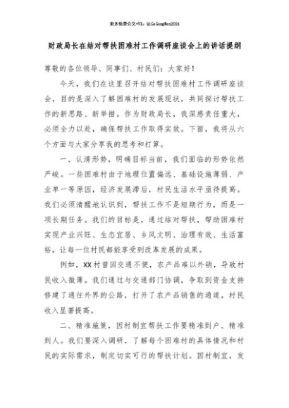 【七哥公文】2024年:财政局长在结对帮扶困难村工作调研座谈会上的讲话提纲+更多免费公文+VX:QiGeGongWen2024