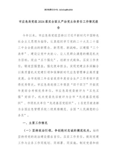 【七哥公文】2024年:市应急局党组2024落实全面从严治党主体责任工作情况报告+更多免费公文+VX:QiGeGongWen2024