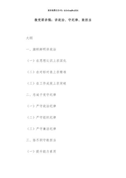 / 【七哥公文】2024年:微党课讲稿:讲政治、守纪律、敢担当+更多免费公文+VX:QiGeGongWen2024