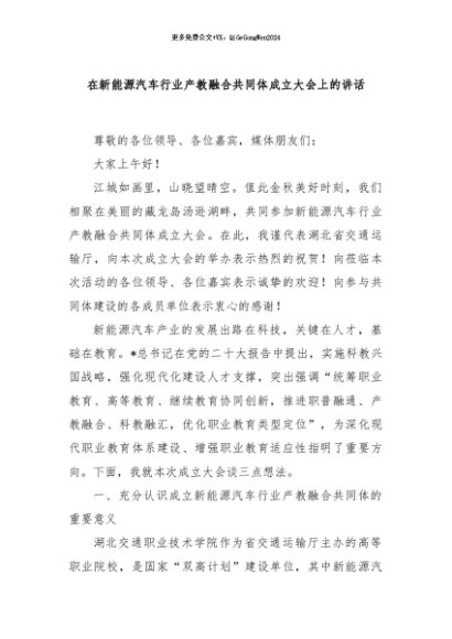 / 【七哥公文】2024年:在新能源汽车行业产教融合共同体成立大会上的讲话+更多免费公文+VX:QiGeGongWen2024