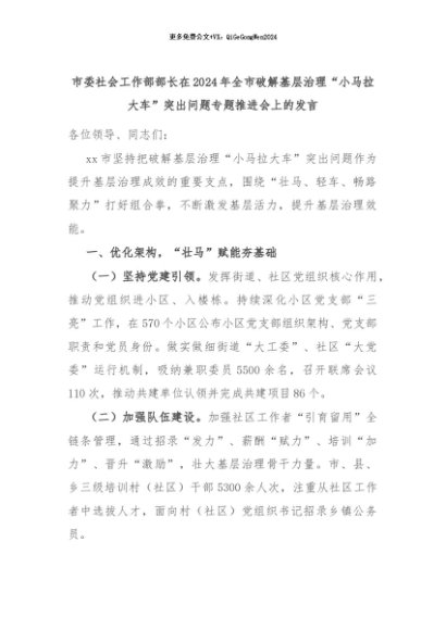 【七哥公文】2024年:市委社会工作部部长在2024年全市破解基层治理“小马拉大车”突出问题专题推进会上的发言+更多免费公文+VX:QiGeGongWen2024