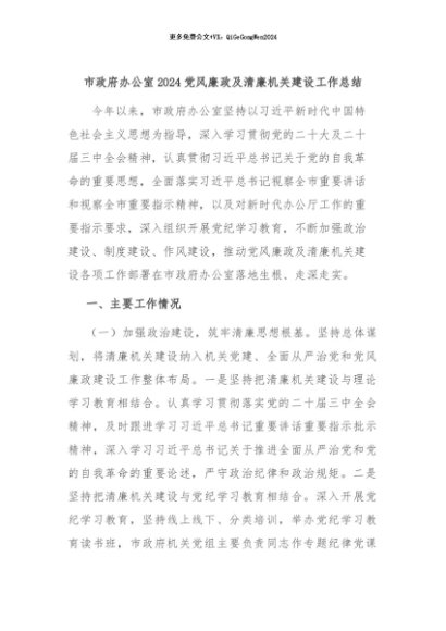 【七哥公文】2024年:市政府办公室2024党风廉政及清廉机关建设工作总结+更多免费公文+VX:QiGeGongWen2024
