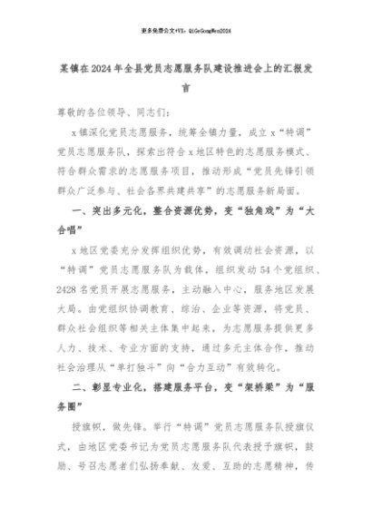 【七哥公文】2024年:某镇在2024年全县党员志愿服务队建设推进会上的汇报发言+更多免费公文+VX:QiGeGongWen2024