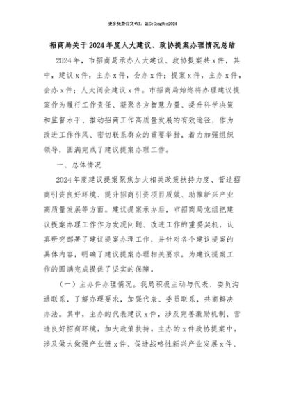 【七哥公文】2024年:招商局关于2024年度人大建议、政协提案办理情况总结+更多免费公文+VX:QiGeGongWen2024