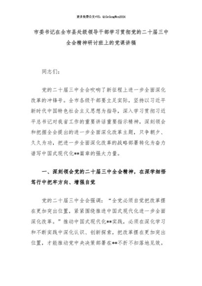 【七哥公文】2024年:市委书记在全市县处级领导干部学习贯彻党的二十届三中全会精神研讨班上的党课讲稿+更多免费公文+VX:QiGeGongWen2024