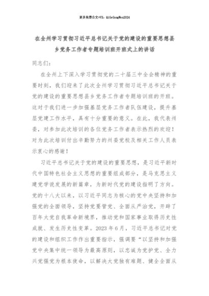 【七哥公文】2024年:在全州学习贯彻习近平总书记关于党的建设的重要思想县乡党务工作者专题培训班开班式上的讲话+更多免费公文+VX:QiGeGongWen2024