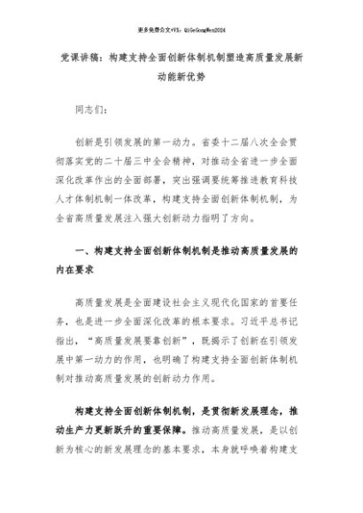 【七哥公文】2024年:党课讲稿:构建支持全面创新体制机制塑造高质量发展新动能新优势+更多免费公文+VX:QiGeGongWen2024