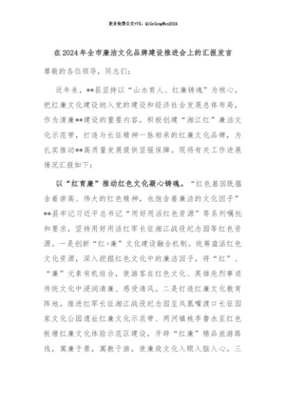 【七哥公文】2024年:在2024年全市廉洁文化品牌建设推进会上的汇报发言+更多免费公文+VX:QiGeGongWen2024