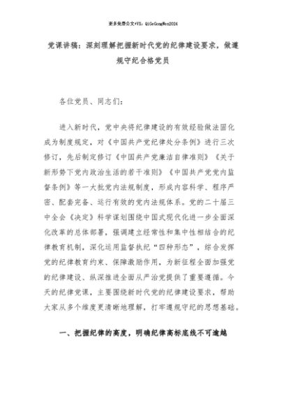 【七哥公文】2024年:党课讲稿:深刻理解把握新时代党的纪律建设要求,做遵规守纪合格党员+更多免费公文+VX:QiGeGongWen2024