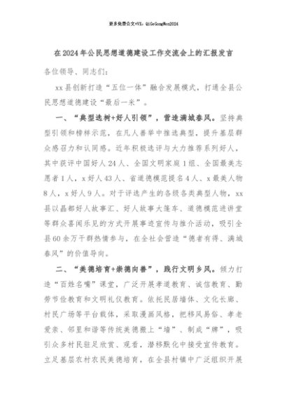 【七哥公文】2024年:在2024年公民思想道德建设工作交流会上的汇报发言+更多免费公文+VX:QiGeGongWen2024