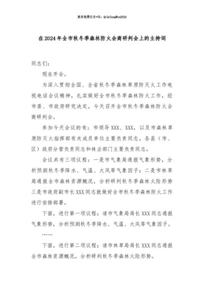 【七哥公文】2024年:在2024年全市秋冬季森林防火会商研判会上的主持词+更多免费公文+VX:QiGeGongWen2024