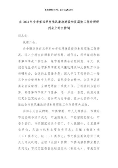 【七哥公文】2024年:在2024年全市第四季度党风廉政建设和反腐败工作分析研判会上的主持词+更多免费公文+VX:QiGeGongWen2024