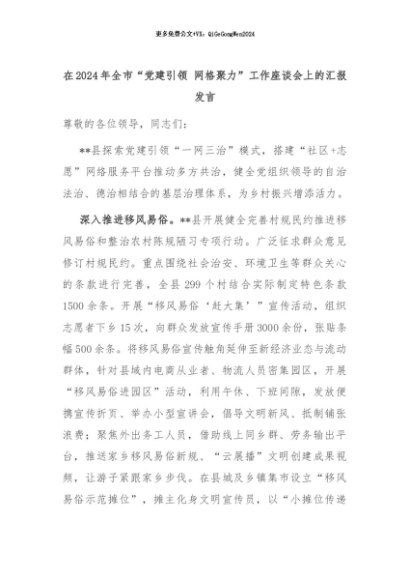 【七哥公文】2024年:在2024年全市“党建引领 网格聚力”工作座谈会上的汇报发言+更多免费公文+VX:QiGeGongWen2024