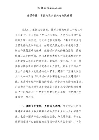 / 【七哥公文】2024年:党课讲稿:牢记为民宗旨矢志为民造福+更多免费公文+VX:QiGeGongWen2024