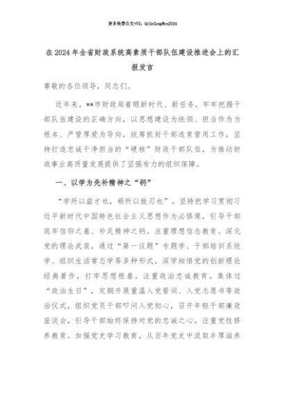 【七哥公文】2024年:在2024年全省财政系统高素质干部队伍建设推进会上的汇报发言+更多免费公文+VX:QiGeGongWen2024