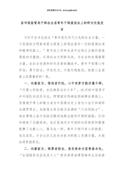 【七哥公文】2024年:县市场监管局干部在全县青年干部座谈会上的研讨交流发言+更多免费公文+VX:QiGeGongWen2024