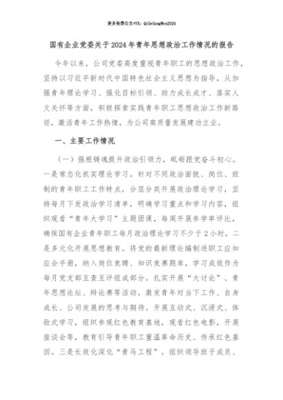 【七哥公文】2024年:国有企业党委关于2024年青年思想政治工作情况的报告+更多免费公文+VX:QiGeGongWen2024