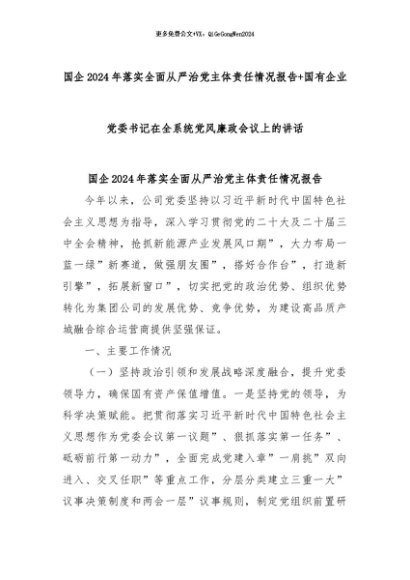 【七哥公文】2024年:国企 2024 年落实全面从严治党主体责任情况报告+国有企业党委书记在全系统党风廉政会议上的讲话+更多免费公文+VX:QiGeGongWen2024