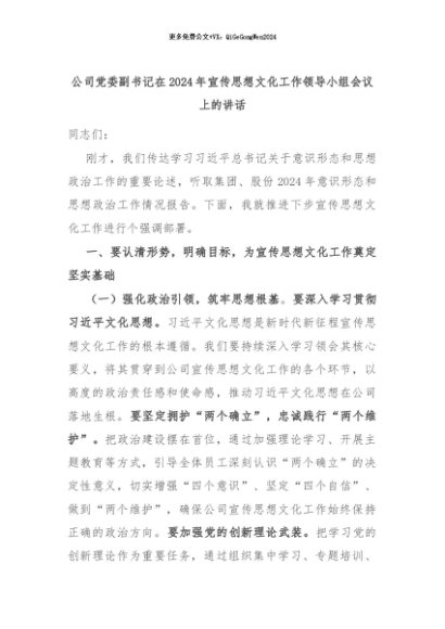 【七哥公文】2024年:公司党委副书记在2024年宣传思想文化工作领导小组会议上的讲话+更多免费公文+VX:QiGeGongWen2024