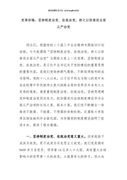 【七哥公文】2024年:党课讲稿:坚持制度治党、依规治党,持之以恒推进全面从严治党+更多免费公文+VX:QiGeGongWen2024
