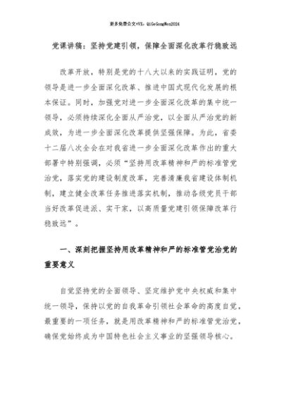 / 【七哥公文】2024年:党课讲稿:坚持党建引领,保障全面深化改革行稳致远+更多免费公文+VX:QiGeGongWen2024