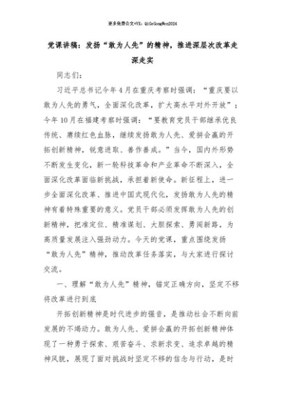 【七哥公文】2024年:党课讲稿:发扬“敢为人先”的精神,推进深层次改革走深走实+更多免费公文+VX:QiGeGongWen2024