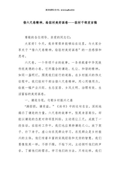 / 【七哥公文】2024年:借六尺巷精神,绘驻村美好画卷——驻村干部发言稿+更多免费公文+VX:QiGeGongWen2024
