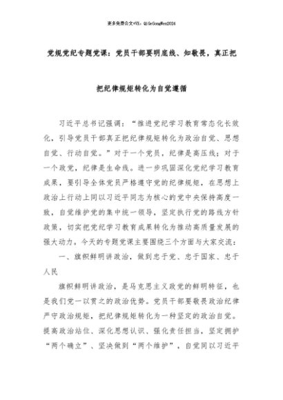 【七哥公文】2024年:党规党纪专题党课:党员干部要明底线、知敬畏,真正把把纪律规矩转化为自觉遵循+更多免费公文+VX:QiGeGongWen2024
