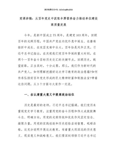 【七哥公文】2024年:党课讲稿:从百年党史中汲取丰厚营养奋力推动单位建设高质量发展+更多免费公文+VX:QiGeGongWen2024