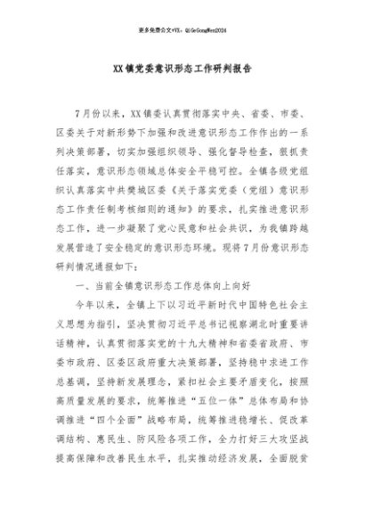/ 【七哥公文】2024年:XX镇党委意识形态工作研判报告+更多免费公文+VX:QiGeGongWen2024