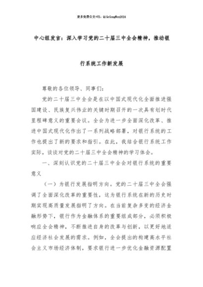 【七哥公文】2024年:中心组发言:深入学习党的二十届三中全会精神,推动银行系统工作新发展+更多免费公文+VX:QiGeGongWen2024