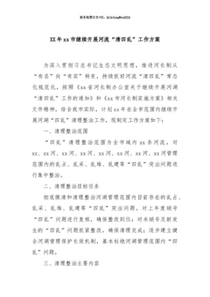 / 【七哥公文】2024年:XX年xx市继续开展河流“清四乱”工作方案+更多免费公文+VX:QiGeGongWen2024