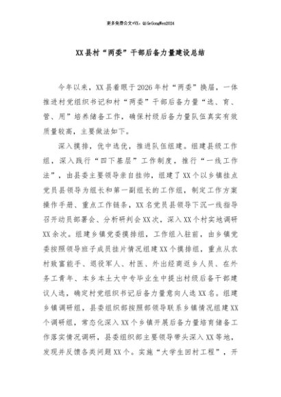 / 【七哥公文】2024年:XX县村“两委”干部后备力量建设总结+更多免费公文+VX:QiGeGongWen2024