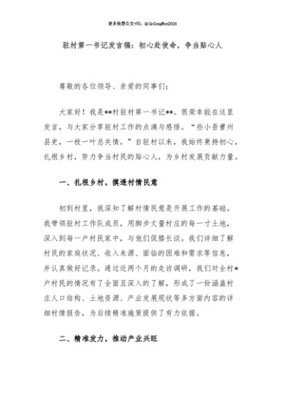 / 【七哥公文】2024年:驻村第一书记发言稿:初心赴使命,争当贴心人+更多免费公文+VX:QiGeGongWen2024