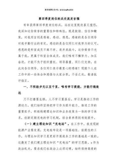 / 【七哥公文】2024年:第四季度岗位标兵交流发言稿+更多免费公文+VX:QiGeGongWen2024