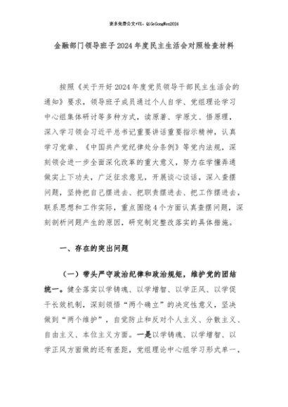 【七哥公文】2024年:金融部门领导班子2024年度民主生活会对照检查材料+更多免费公文+VX:QiGeGongWen2024