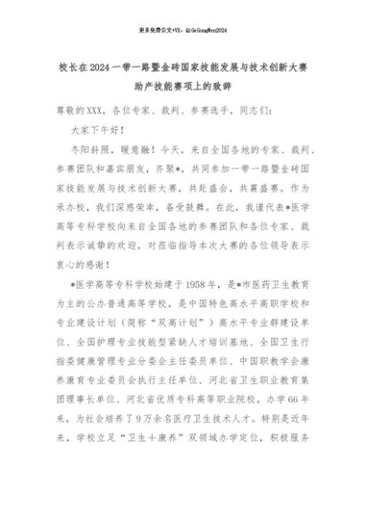 【七哥公文】2024年:校长在2024一带一路暨金砖国家技能发展与技术创新大赛助产技能赛项上的致辞+更多免费公文+VX:QiGeGongWen2024