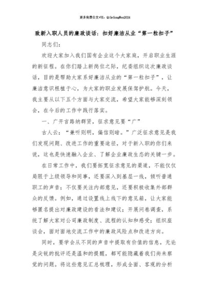 【七哥公文】2024年:致新入职人员的廉政谈话:扣好廉洁从业“第一粒扣子”+更多免费公文+VX:QiGeGongWen2024