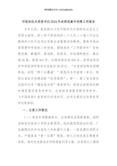 【七哥公文】2024年:市政协机关党委书记2024年述职述廉书党建工作报告+更多免费公文+VX:QiGeGongWen2024