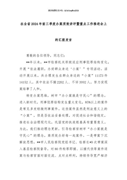 【七哥公文】2024年:在全省2024年前三季度办案质效讲评暨重点工作推进会上的汇报发言+更多免费公文+VX:QiGeGongWen2024
