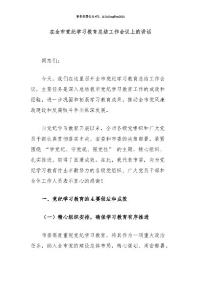/ 【七哥公文】2024年:在全市党纪学习教育总结工作会议上的讲话+更多免费公文+VX:QiGeGongWen2024