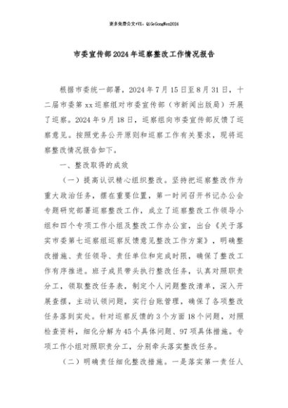/ 【七哥公文】2024年:市委宣传部2024年巡察整改工作情况报告+更多免费公文+VX:QiGeGongWen2024