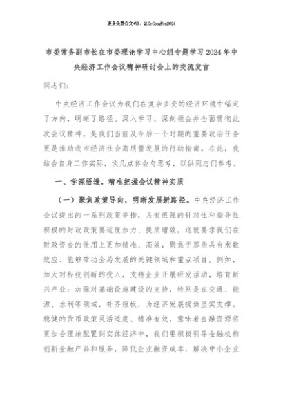 【七哥公文】2024年:市委常务副市长在市委理论学习中心组专题学习2024年中央经济工作会议精神研讨会上的交流发言+更多免费公文+VX:QiGeGongWen2024