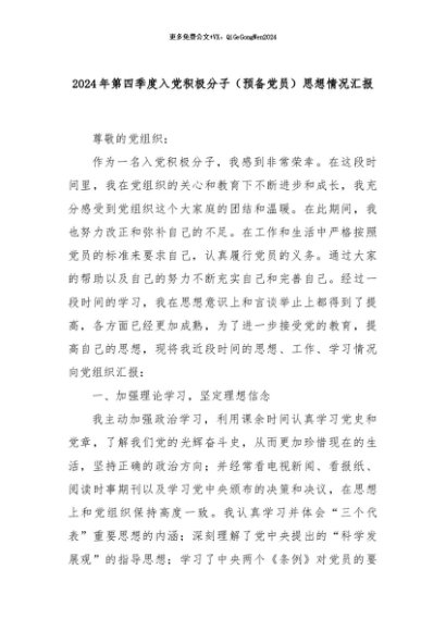 【七哥公文】2024年:2024年第四季度入党积极分子(预备党员)思想情况汇报+更多免费公文+VX:QiGeGongWen2024