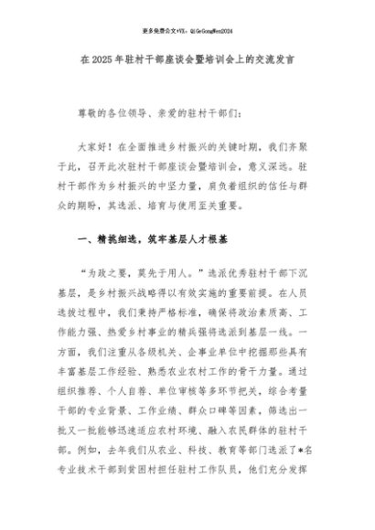 / 【七哥公文】2024年:在2025年驻村干部座谈会暨培训会上的交流发言+更多免费公文+VX:QiGeGongWen2024