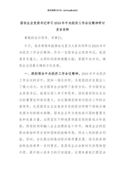 【七哥公文】2024年:国有企业党委书记学习2024年中央经济工作会议精神研讨发言材料+更多免费公文+VX:QiGeGongWen2024