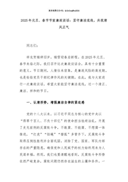 【七哥公文】2024年:2025年元旦、春节节前廉政谈话:坚守廉洁底线,共筑清风正气+更多免费公文+VX:QiGeGongWen2024