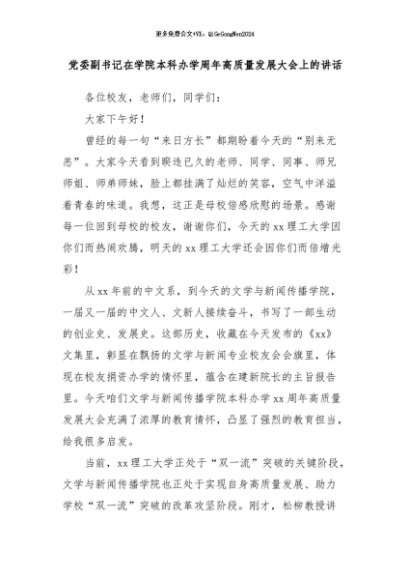 【七哥公文】2024年:党委副书记在学院本科办学周年高质量发展大会上的讲话+更多免费公文+VX:QiGeGongWen2024